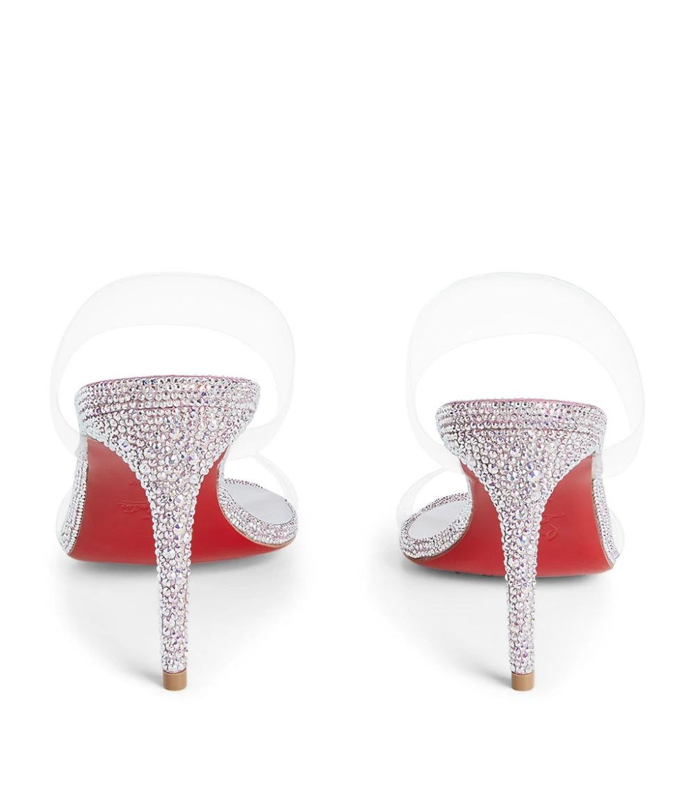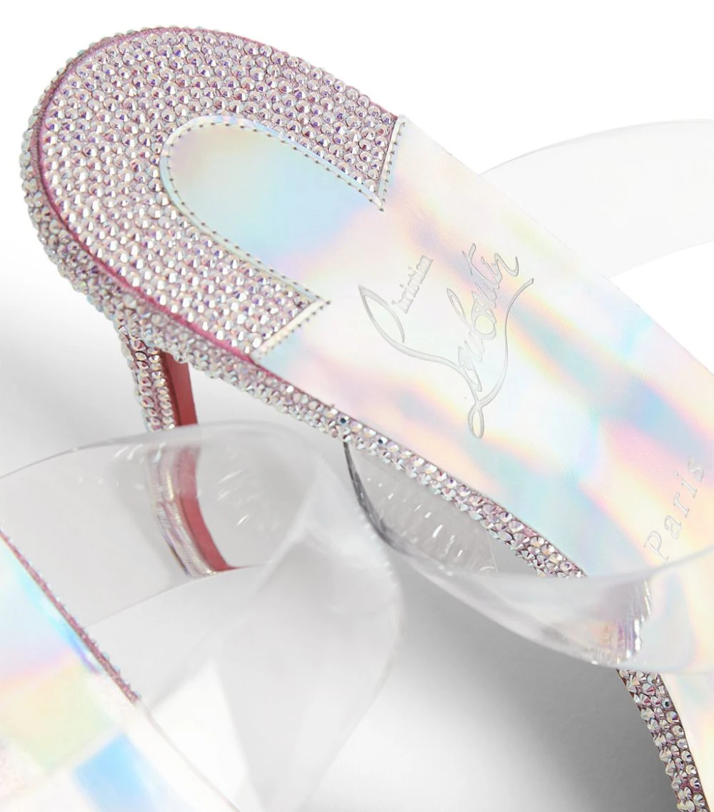 The Just Nothing mules from Christian Louboutin delicately bridge the gap between minimalism and maximalism. Enhanced and exposed, the foot follows the natural curve that’s granted from the stiletto heel, held in place by two transparent straps. In contrast, the leather upper arrives covered in an amass of dazzling embellishments – all of which is elegantly complemented by the fiery-red sole and the pin-sharp heel.